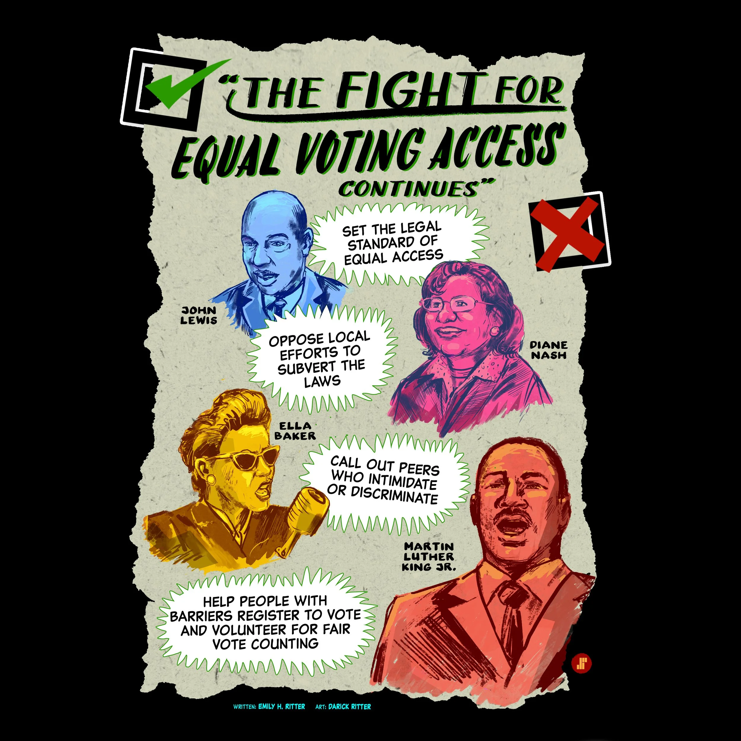 To answer the call of civil rights leaders past and present, people should do much more than march in support of national legislation. They should oppose local efforts to subvert those laws with their voices and votes. They should spread values of equity and equality in their communities of people who support and act on disenfranchising policies, calling out peers who intimidate and discriminate. They should help people who face structural and personal barriers that keep them from the polls to register and vote, and volunteer to ensure fair vote counts.